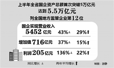 據統計,今年上半年,江西省國有企業資產總額首次突破5萬億元,達到5.5萬億元;實現營業收入5452億元、增加值716億元、利潤205億元,同比分別增長43%、37%、136%,兩年平均增長29%、15%、22%;資產總額、凈利潤、營業收入在全國分列12位、13位、12位。