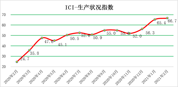 2021年2月份,中國工業(yè)綜合指數(shù)(以下簡稱ICI)為58.4%,環(huán)比下降0.2個百分點(diǎn),受春節(jié)效應(yīng)影響小幅回落,自去年4月份以來連續(xù)位于榮枯線以上,表明中國工業(yè)經(jīng)濟(jì)總體持續(xù)恢復(fù)。生產(chǎn)狀況指數(shù)為66.7%,環(huán)比上漲1.3個百分點(diǎn),繼續(xù)保持高位,企業(yè)生產(chǎn)活動積極平穩(wěn)進(jìn)行。效益狀況指數(shù)為52.5%,環(huán)比下降0.5個百分點(diǎn),小幅回落。經(jīng)營環(huán)境指數(shù)為54.5 %,環(huán)比回落0.5個百分點(diǎn),在保持較高位的基礎(chǔ)上連續(xù)位于榮枯線之上,反映了市場經(jīng)營環(huán)境持續(xù)改善。融資難易指數(shù)為47.2%,環(huán)比下降1.0個百分點(diǎn),持續(xù)位于榮枯線下方,且該指數(shù)仍低于50%的均衡線,表明當(dāng)前企業(yè)融資難融資貴的問題持續(xù)存在,針對此難題還需更有效的貨幣、財政政策等。預(yù)期發(fā)展指數(shù)為59.6 %,環(huán)比下降1.8個百分點(diǎn),有所回落但持續(xù)位于榮枯線以上,該指數(shù)依舊長期保持高位優(yōu)勢。ICI制造業(yè)指數(shù)為60.1 %,環(huán)比回落0.3個百分點(diǎn),但處于高位,自去年4月份以來連續(xù)位于榮枯線以上,表明制造業(yè)總體持續(xù)回暖。