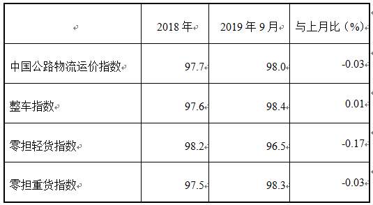 2019年9月份,由中國物流與采購聯合會和林安物流集團聯合調查的中國公路物流運價指數為98點,與上月相比小幅回落0.03%,但比去年同期增長2.6%。月內各周指數運行平穩,其中第一、四周運價指數環比回落,第二、三周環比回升。