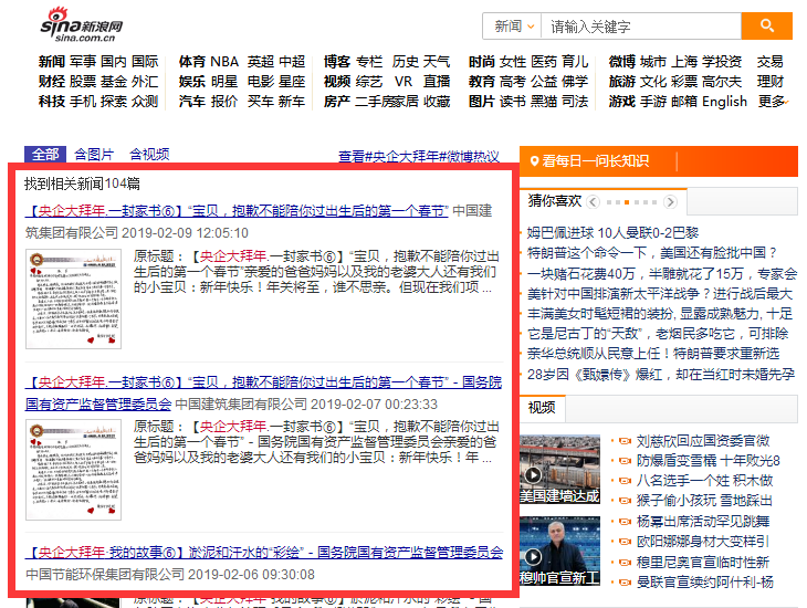 “每逢佳節倍思親,總有‘守侶’兩地分。”新春佳節,是萬家團圓的日子,央企海外工地一線建設者、援藏援疆干部、崗位值守人員因工作不能與家人團聚。2019年春節期間,國資委網站溫情推出“2019央企大拜年”專題,以“一個故事、一封家書、一段視頻”的方式表達央企人的責任擔當與濃濃親情。專題于2月4日(農歷大年三十)推出,一上線就收到多方好評,新華網、中青在線、新浪網等權威媒體平臺在重要位置轉載轉發,受到廣大網友熱評,閱讀量超過37萬。其中,“央企大拜年”短視頻播放量達35萬次。