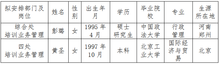 根據事業單位公開招聘相關規定,按照“公開、平等、競爭、擇優”的原則,國務院國資委干教中心先后完成公開報名、資格審查、筆試、面試、體檢、考察等程序,經研究,擬聘用以下2020年應屆畢業生為我中心工作人員,現公示如下: