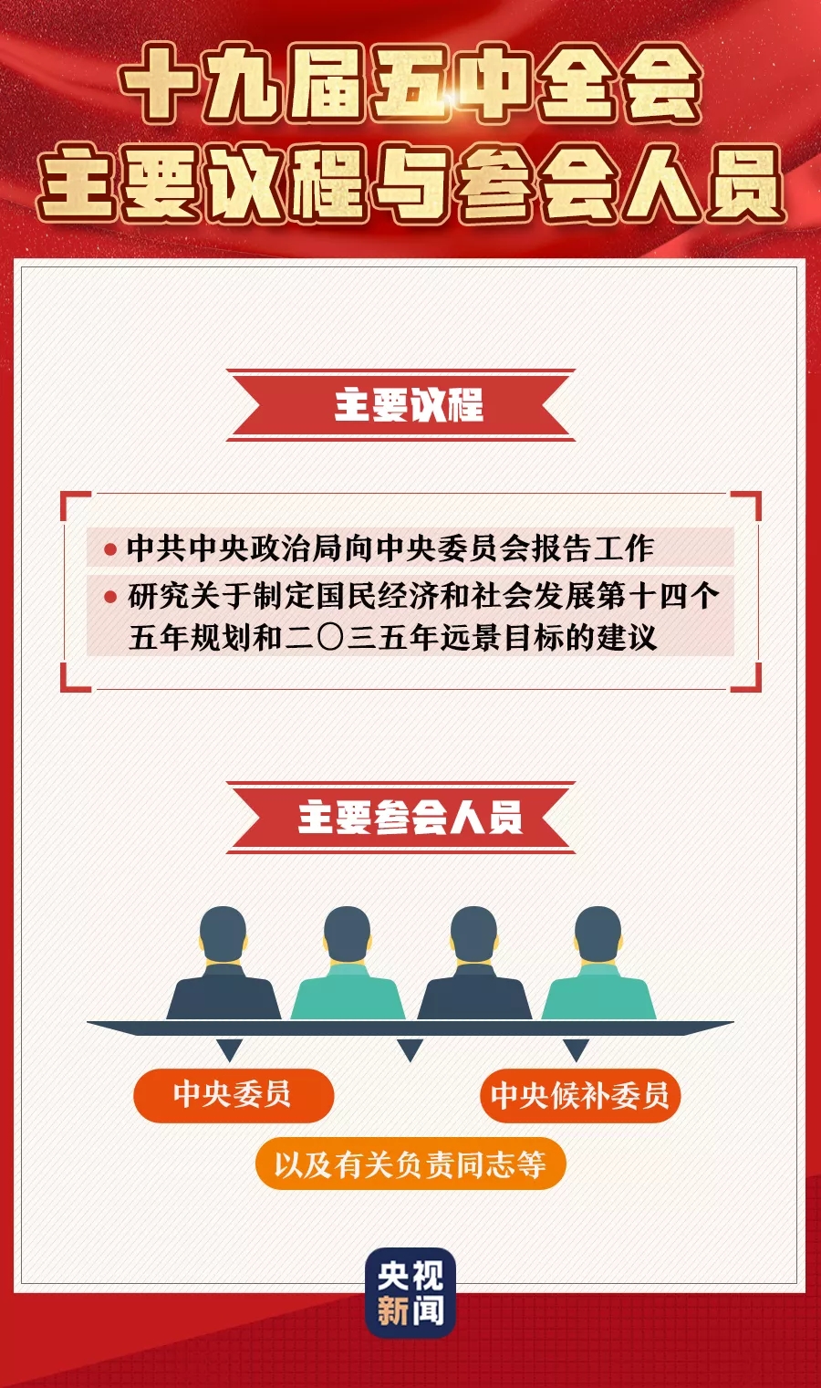 中國共產黨第十九屆中央委員會第五次全體會議26日上午在京召開。中央委員會總書記習近平代表中央政治局向全會作工作報告,并就《中共中央關于制定國民經濟和社會發展第十四個五年規劃和二〇三五年遠景目標的建議(討論稿)》向全會作了說明。