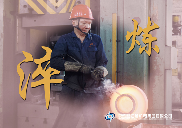 鍛造工人用夾鉗將通紅的鍛件從加熱爐中取出。