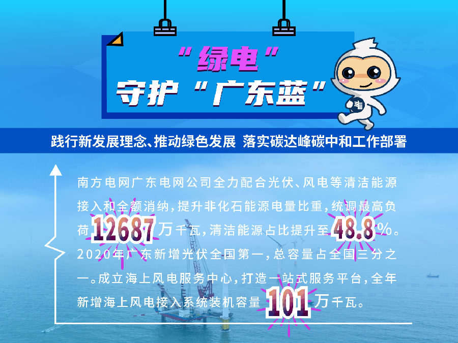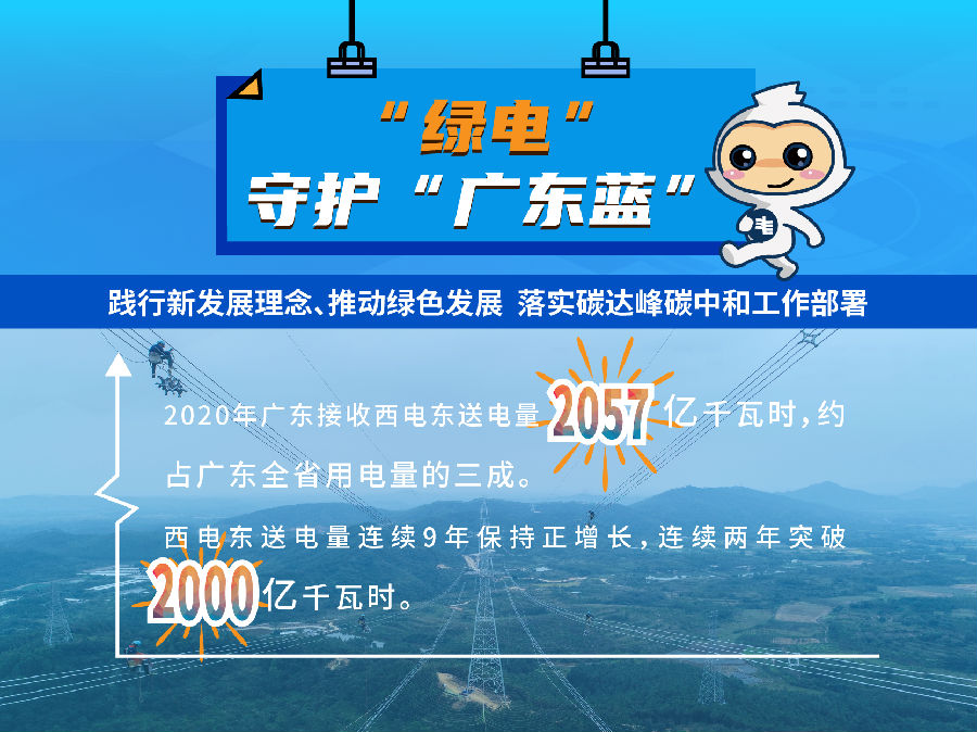 2020年廣東空氣質量持續改善,主要污染物連續六年達標。南方電網公司通過建設堅強電網、加大西電清潔能源輸送、引導社會科學用電等措施,讓綠色清潔能源有力支援實現“廣東藍”。2020年,廣東接收西電連續9年維持正增長,建成烏東德送電廣東特高壓柔性直流示范工程,推進電能替代,加快風電、光伏等清潔能源接入,在最高負荷12687萬千瓦、全年用電量持續增長的情況,以綠色電力守護廣東碧水藍天。一組圖帶你認識“綠電”如何守護“廣東藍”。
