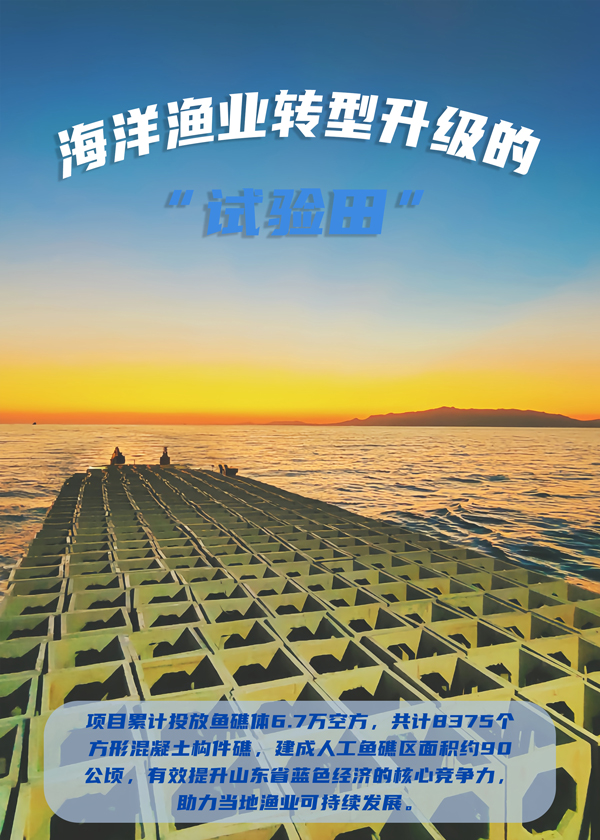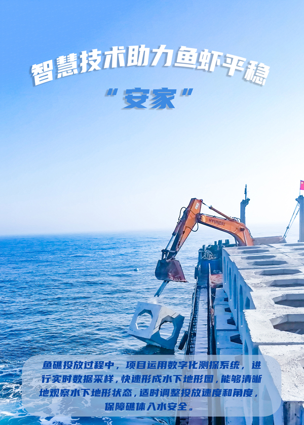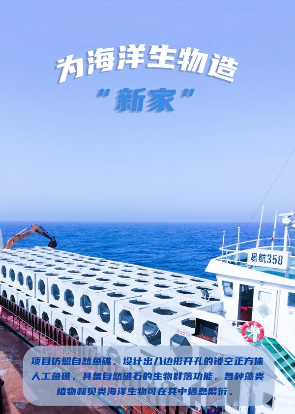 由中交集團下屬一航局承建的國信海洋牧場人工魚礁一、二期工程,位于山東省青島田橫島東南部海域。項目建設過程中,累計向海底投放魚礁體6.7萬空心方樁,共計8375個,形成10個單位人工海底魚礁群。項目的完工,不僅為海域內海洋生物提供了良好的繁殖、生長、棲息環境,也為海參和魚類漁場提供優異的養殖、庇護場所,將漁業與受損海洋生態系統修復巧妙結合,助力可持續發展。