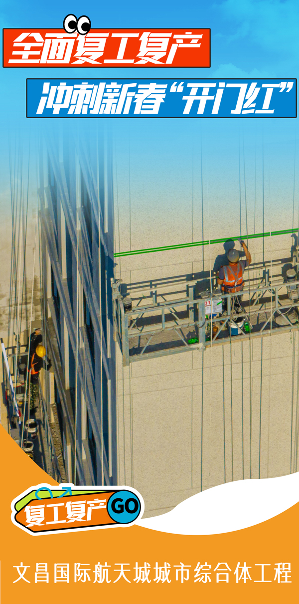 中鐵十四局文昌國際航天城城市綜合體項目建設現場,作業人員在進行外墻裝飾作業,全力沖刺既定節點目標。