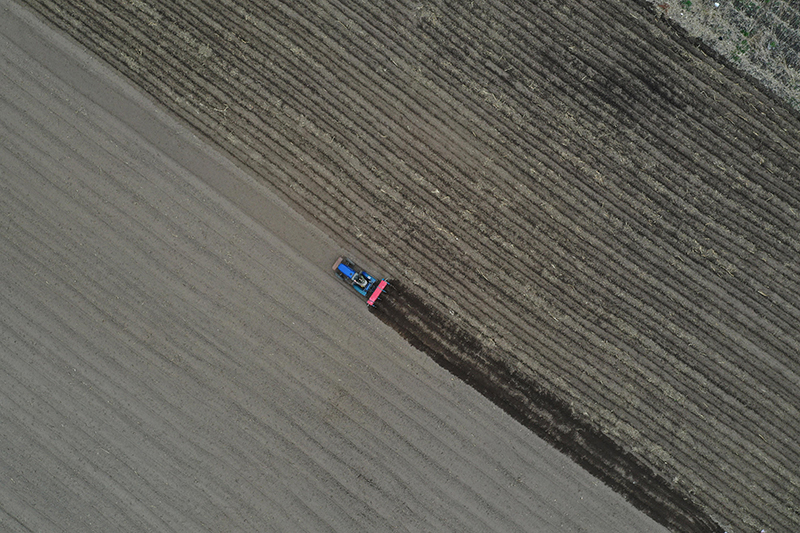吉林省安圖縣龍山村農民在田間播種玉米(5月8日無人機拍攝)。