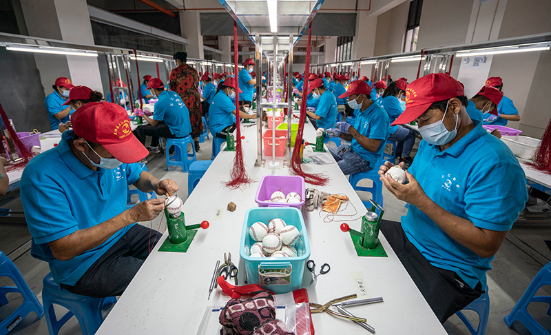 5月14日,云南省怒江傈僳族自治州怒江新城城墻壩易地扶貧安置點棒球工廠的工人在制作棒球。