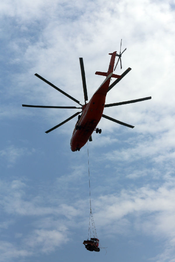 據介紹,此次演練,以長江流域重要堤防出現重大險情為背景,模擬長江洪湖段水位急速上漲,洪湖龍口鎮中洲島附近堤岸壓力陡增,隨時可能出現“崩岸險情”,由此開展了一場運用大型直升機遂行應對處置堤防險情的行動。演練旨在探索航空力量執行堤防搶險的機制,摸索具有示范效應的航空應急救援模式。這也是國內首次運用大型直升機遂行應對重大堤防險情的演練。其中,“空投集裝箱”科目是一次全新的封堵技術探索。將廢棄集裝箱配重、打孔、注水增重,由米-26直升機吊裝投入水體后,形成重達44噸的巨大構件,以水治水,可迅速沉降填堵,有效應對決口險情,這也是世界上首次用大型直升機吊掛集裝箱用于堤壩決口封堵的實踐探索,開創了世界先例。