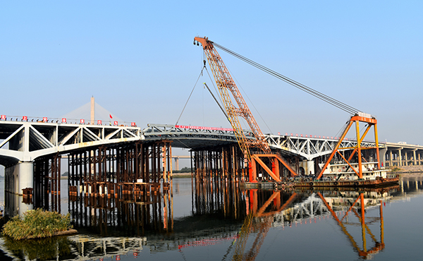 由中國(guó)鐵建所屬中鐵十五局負(fù)責(zé)施工的海河特大橋位于津南區(qū)與濱海新區(qū)交匯處,全長(zhǎng)1640米,主橋采用3跨鋼混組合連續(xù)桁架結(jié)構(gòu)橫跨海河,用鋼量1.2萬(wàn)噸。該橋設(shè)計(jì)新穎、結(jié)構(gòu)復(fù)雜、技術(shù)含量高、施工難度大,是濱海新區(qū)和全線重點(diǎn)建設(shè)項(xiàng)目。