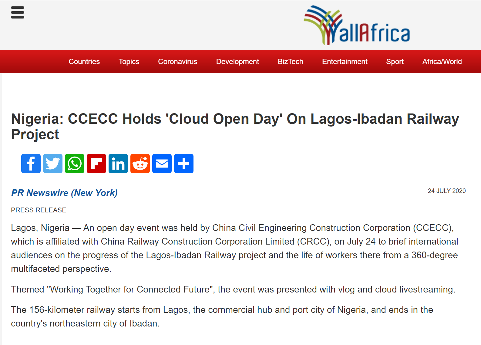 同時,尼日利亞拉伊鐵路云開放日還受到海外媒體,尤其是非洲媒體的廣泛報道。南非新聞報刊(AllAfica)、美通社(PR Newswire)、亞洲通訊社(IANS)、非洲商業網(Africa Business)、曼哈頓周報(Manhattanweek)、納米比亞通訊社(Namibia Press Agency)等20家來自英國、印度、澳大利亞、尼日利亞、美國,以及非洲地區的國際媒體對活動日給予大力報道,覆蓋國際受眾154萬余人。引發包括彭博新聞、彭博社阿聯酋辦事處、華爾街日報中文版等在內的108家國際媒體對拉伊鐵路云開放日的關注興趣。