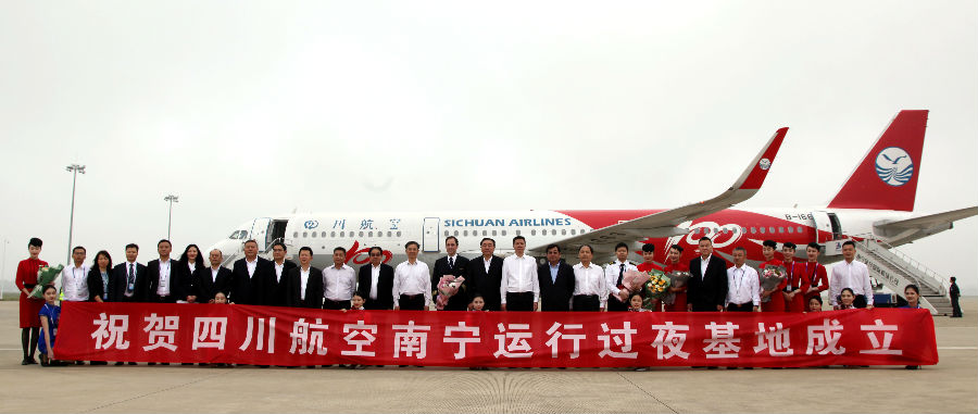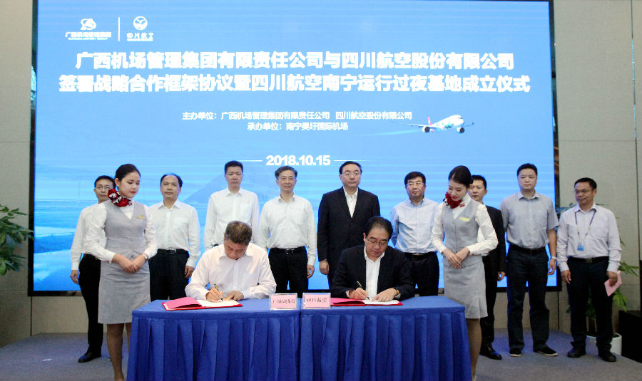10月15日,四川航空股份有限公司(以下簡稱川航)與廣西機場管理集團有限責任公司(以下簡稱廣西機場管理集團)簽署戰略合作框架協議,同日川航南寧運行過夜基地正式掛牌運行。川航南寧運行基地正式成立,南寧吳圩國際機場駐場航空公司基地達到了5家,川航在成都總部以外的分公司及基地數量達到了11個。