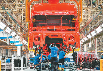 陜西汽車控股集團(tuán)有限公司重卡總裝線現(xiàn)場(chǎng)。