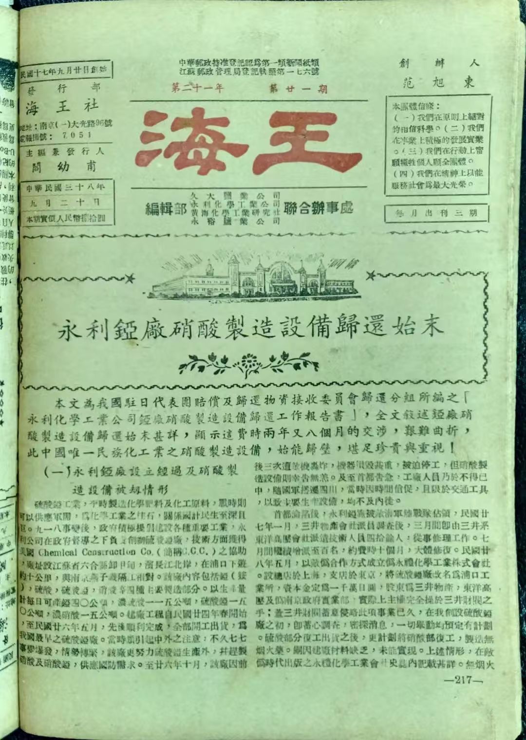 抗戰勝利后,永利人回到工廠發現硝酸設備不翼而飛。侯德榜帶領同人與盟軍經過多次談判交鋒,據理力爭,終于索回全套硝酸設備。1952年硝酸裝置原址安裝重新投入生產,為新中國經濟建設做出重要貢獻。