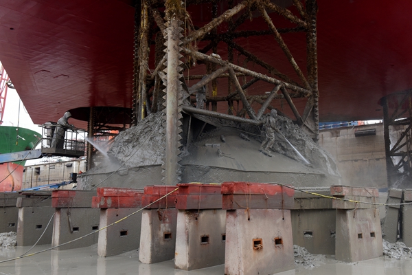 盡管攻堅場景處處有,但令我念念不忘的,還是干塢底部那個最不起眼、最沒含金量的作業項目清洗樁靴。