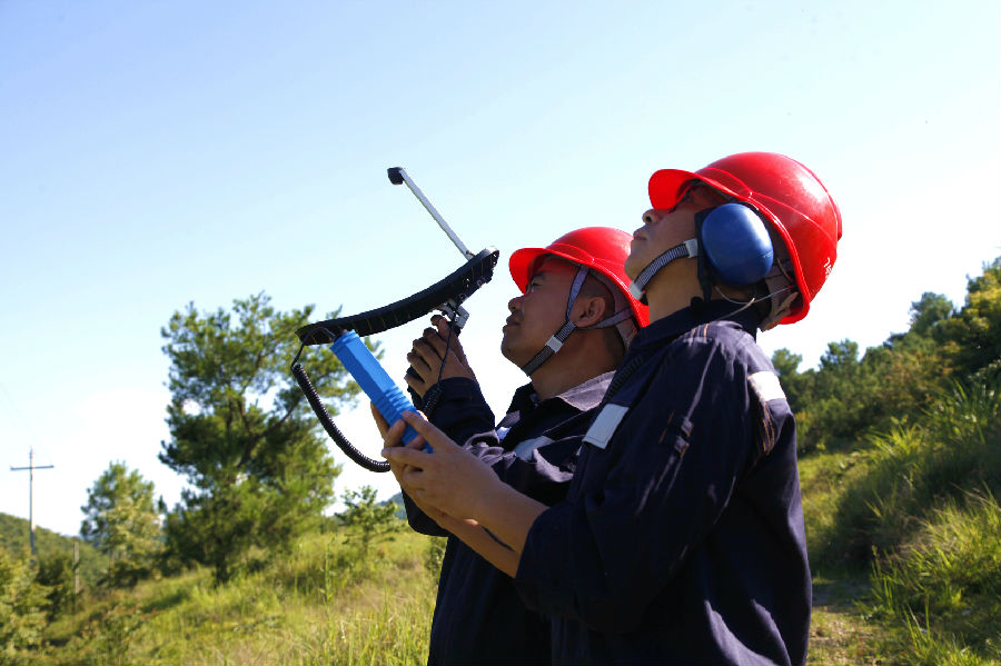 南方電網(wǎng)“天眼供電服務(wù)隊(duì)”運(yùn)用超聲波測(cè)試儀對(duì)“天眼”配套輸電線路35千伏克射線進(jìn)行檢測(cè)。陳競(jìng) 攝