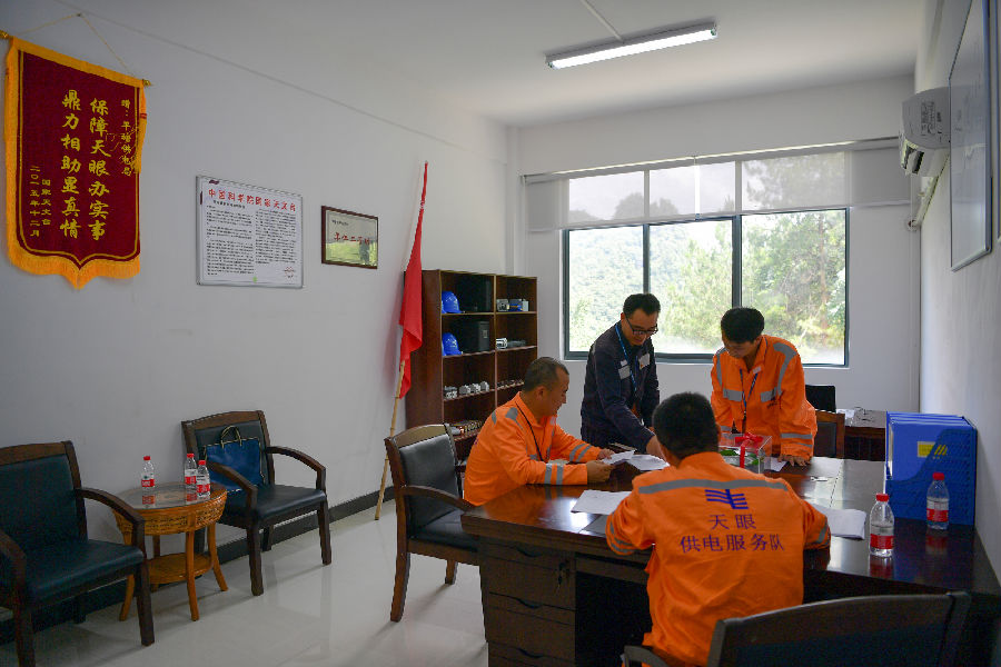 “天眼”基地距離供電所29公里,車程需要25至30分鐘。隨著一批又一批的天文觀測(cè)成果不斷涌現(xiàn),可靠的電力支撐和快速的服務(wù)響應(yīng)顯得尤為重要。2016年,在“寸土寸金”的“天眼”綜合樓內(nèi)部,“天眼”管理部門為服務(wù)隊(duì)特設(shè)了一間“天眼供電小家”。