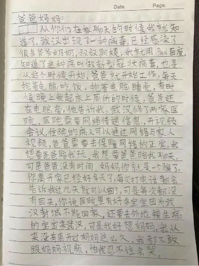 “爸爸媽媽,從你們的聊天中我知道武漢出現了一種病毒,很多人已經感染,我上網知道了這種病毒叫作新型冠狀病毒(肺炎),也是從這個時候開始,爸爸每天抱著電腦吃飯、抱著電腦睡覺,有時候晚上我起床上廁所的時候,爸爸還在電腦旁,他告訴我,武漢修了兩家醫院,需要網絡傳遞信息、開視頻會議,爸爸要去保障網絡的正常。我想要爸爸陪我玩,陪我聊天,可爸爸沒有時間。”
