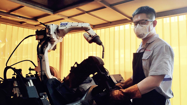 提到焊接,人們或許首先想到的是火花四濺、云霧繚繞,尤其夏季,汗流浹背是家常便飯。工作苦、環境差,這些并不能阻擋龐聰對這項工作探求的渴望,在他眼里,焊接機器人崗位簡直就是個“寶藏”:它不僅糅合了數控編程和焊接技藝,而且對操作員的觀察力、辨別力、責任心以及經驗儲備都提出了很高的要求,對年輕員工鍛煉價值很大。