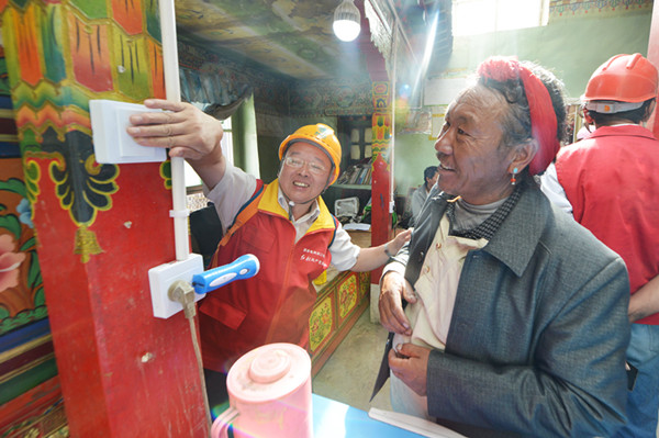 2018年6月,錢海軍率志愿者前往西藏仁布縣開展“千戶萬燈”公益項目。圖為錢海軍為當地村民修理家中的電燈