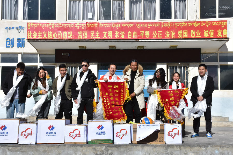 2020年,水電九局采購牦牛肉、青稞面等當地特色農產品,以捐代購,助推消費扶貧。組織全體職工通過公益捐贈方式,向當地小學捐贈體育器材、御寒衣帽,“助學筑夢情暖人心,熱心公益慈心善舉”錦旗飄飄,當地村民揚起了笑臉。