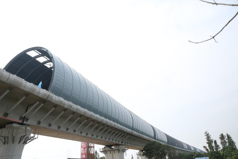 由于深茂鐵路途經(jīng)“小鳥天堂”景區(qū)附近,為有效保護(hù)“小鳥天堂”一帶的生態(tài)環(huán)境,施工中采用全球首例全封閉聲屏障,該聲屏障全長2036.35米,施工工期為60天,主要由拱形鋼構(gòu)架和金屬吸、隔聲板及ECC混凝土吸聲板組成,在全球高速鐵路建設(shè)中屬首創(chuàng)。