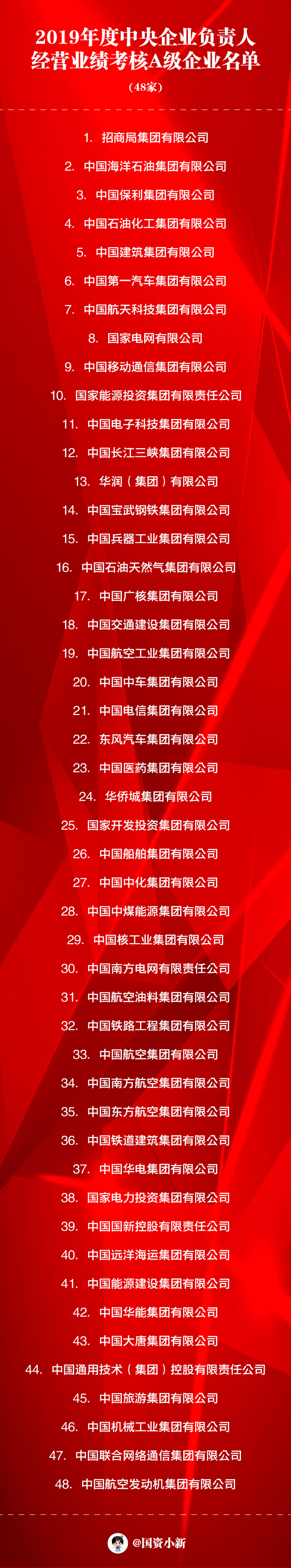 根據(jù)《中央企業(yè)負責人經(jīng)營業(yè)績考核辦法》,2019年度中央企業(yè)負責人經(jīng)營業(yè)績考核結果已經(jīng)國資委黨委會議審議通過,現(xiàn)將A級企業(yè)名單通報如下: