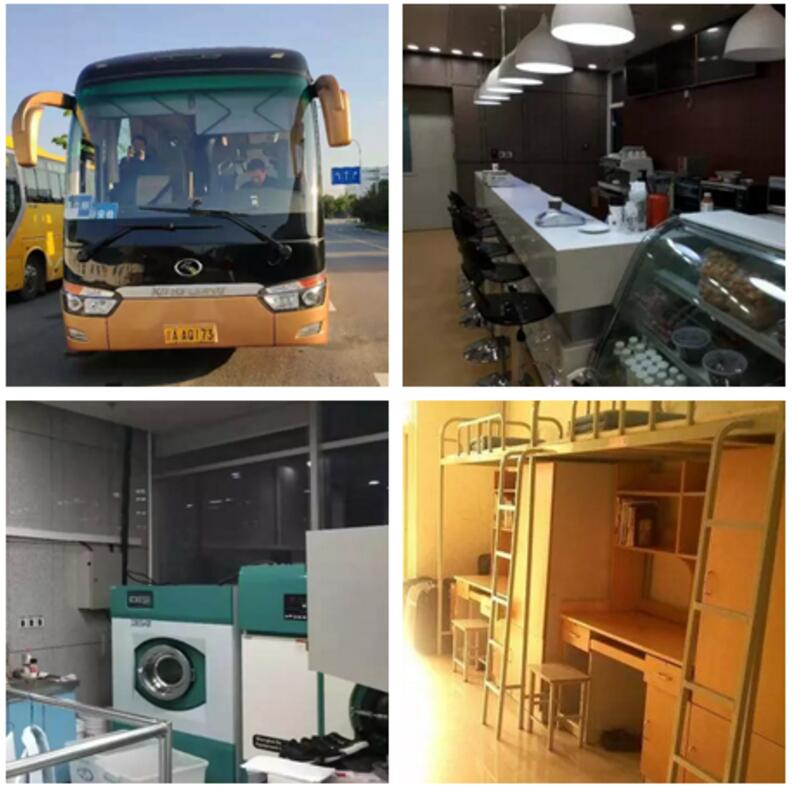 圖片依次為班車、咖啡廳、洗衣房、宿舍