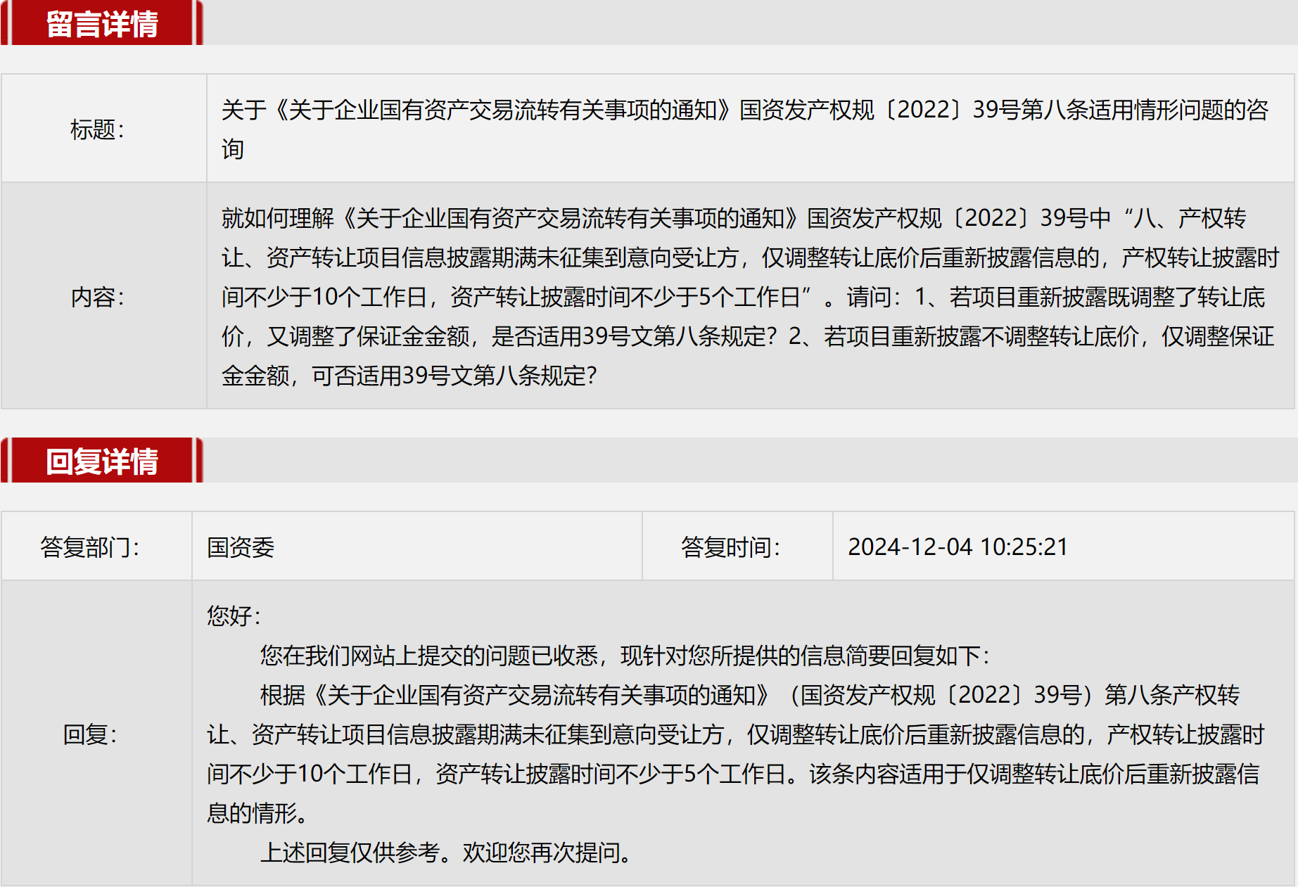 1.關于《關于企業國有資產交易流轉有關事項的通知》國資發產權規〔2022〕39號第八條適用情形問題的咨詢
