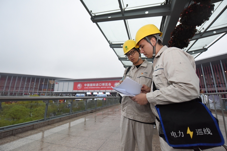 傅道峰正在與同事在進博會核心區(qū)域進行線路特巡