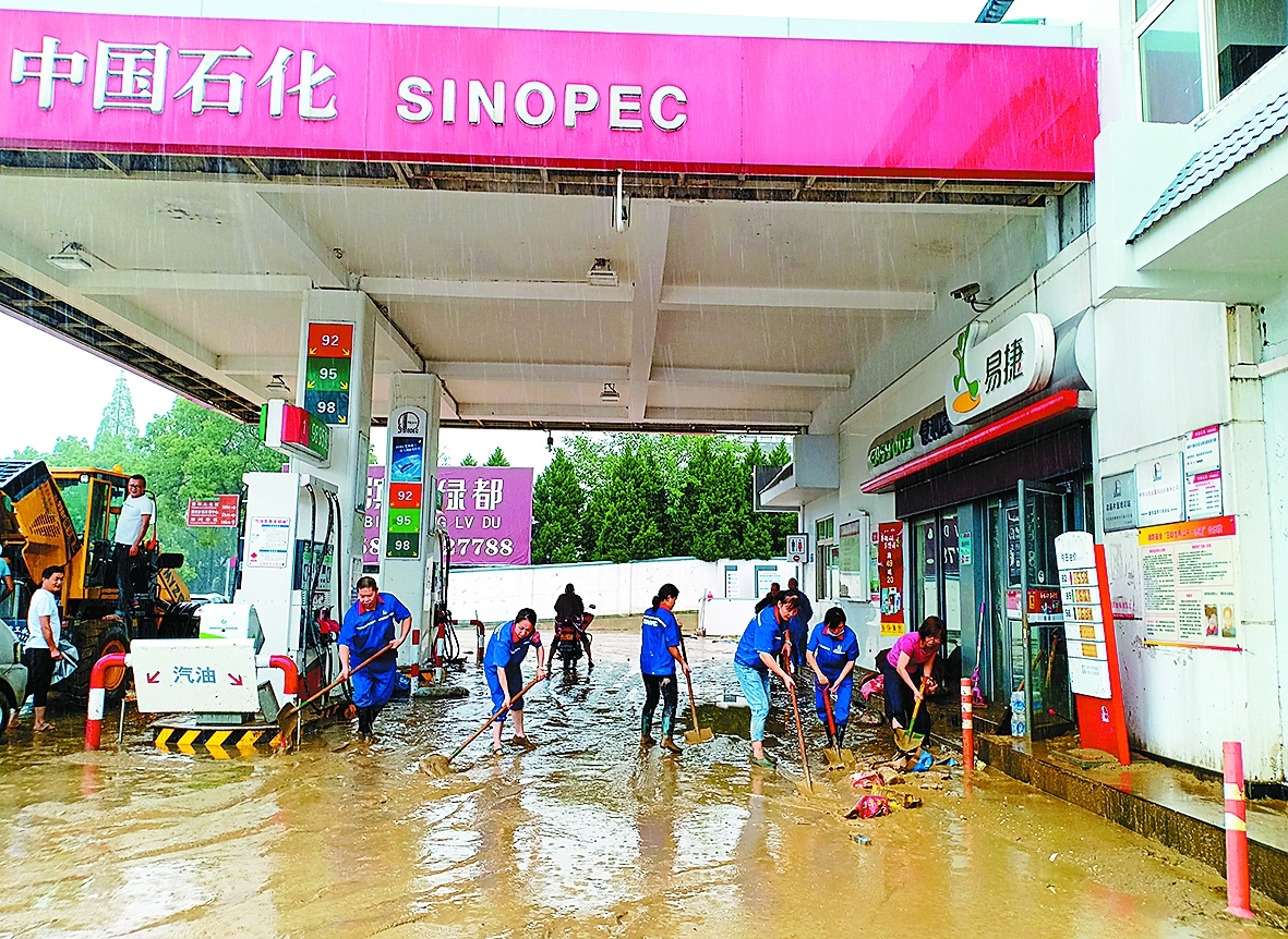 7月8日,安徽黃山歙縣石油富資河加油站積水最深處達2.2米。水退后,黃山石油迅速清理站內淤泥,排查站點設備,確保第一時間恢復營業。圖為黃山歙縣石油員工清理站內積水和淤泥。