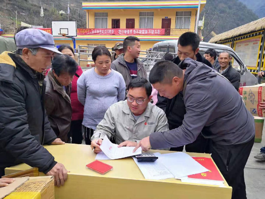國家能源集團云南新能源公司員工在掛靠幫扶點為村民發放登記土雞苗