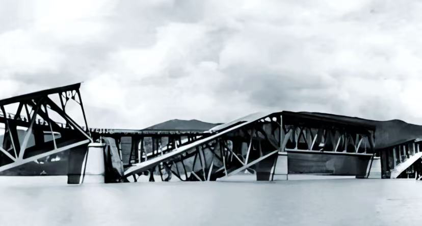 1937年12月,為阻止日軍南下,茅以升忍痛親手炸毀了自己設計的錢塘江大橋,而這座橋通車才不到3個月。照片里,傲立潮頭的錢塘江大橋在巨大的爆炸聲中轟然斷裂,鋼梁扭曲塌陷,沉入江水中。