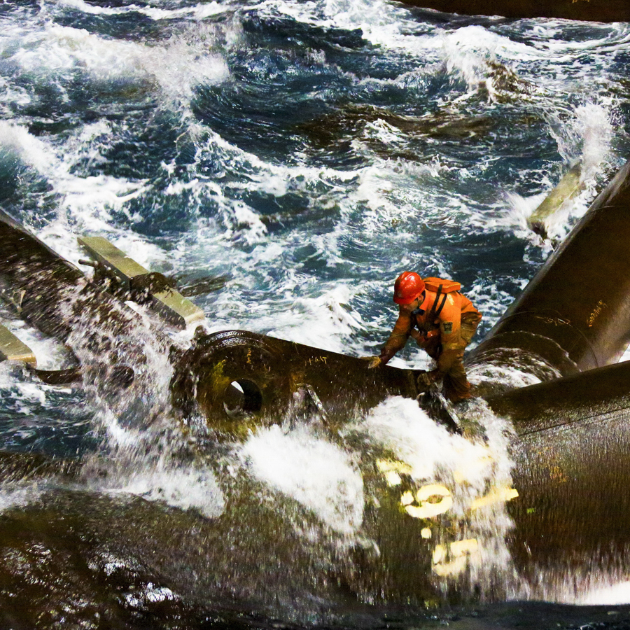作品說明:2015年3月,我國某海域海上采油平臺導管架海上安裝現場,潛水員正在為導管架的扶正吊裝做準備工作,年輕的潛水員時而被冰冷的海水淹沒,寒冷和涌浪是對他們身體和意志的考驗,但他們毫不畏懼艱難。