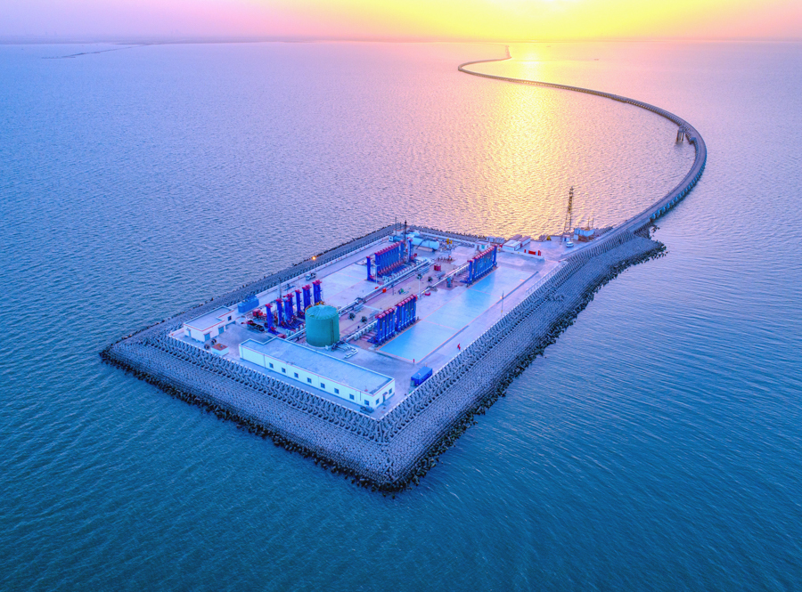 作品說明:勝利油田堅持“綠水青山就是金山銀山”的理念,對青東5 區塊以海油陸采開發模式進行開采,實現油田開發與環境和諧統一。目前,該區塊共有油水井64口,年產能18.5 萬噸,擁有灘海陸岸平臺1 座、陸岸終端站1 座,實現工區污水零排放、零污染,是勝利灘海油田“四化”建設示范區。圖為2018年5月23日拍攝的山東東營勝利油田青東5 區塊海油陸采平臺。
